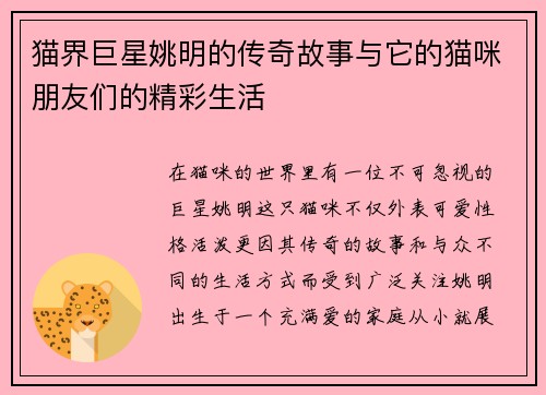 姚明,这位中国篮球的传奇人物,不仅在球场上创造了辉煌的成就,也成为了中美文化交流的重要桥梁。通过一系列精美的海报和漫画,姚明的篮球生涯被生动展现,同时也体现了中国体育文化的深厚底蕴。这些作品不仅是对姚明个人经历的回顾,更是对整个中国篮球发展历程的总结与升华。文章将从四个方面深入探讨“姚明海报漫画展现传奇篮球生涯与中国体育文化的完美结合”,分别为:姚明的职业生涯、影响力与贡献、中国传统文化元素融入、...